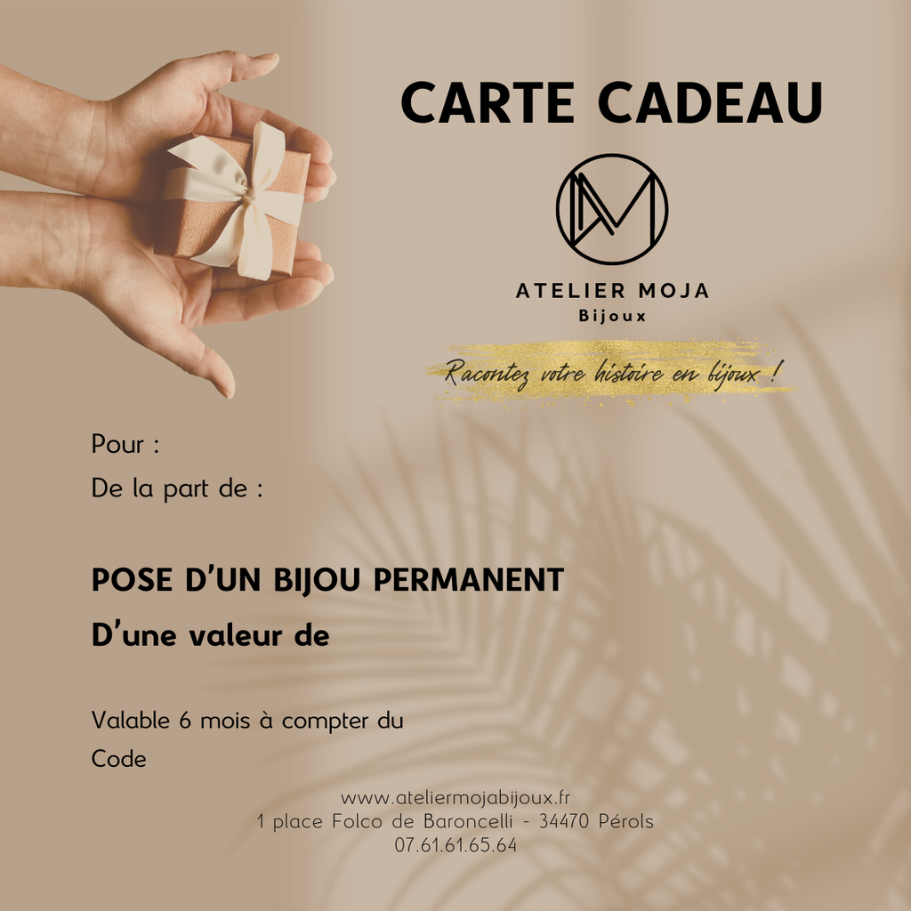 Vous souhaitez immortaliser un moment précieux avec un bijou unique mais vous ne savez pas lequel choisir ? La carte cadeau “Bijou permanent” permet de vivre une expérience sur mesure, pour la pose d'un bijou en argent, vermeil ou or 14k.